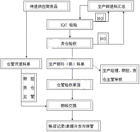 4、供應(yīng)商所送物料為誤送,超送或其他原因,經(jīng)物控、采購(gòu)、總經(jīng)理協(xié)商簽名后,辦理退貨手續(xù)。此類(lèi)退料不計(jì)入財(cái)務(wù)核算范圍。