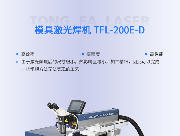 出口型模具激光焊機(jī)是通發(fā)激光公司專(zhuān)門(mén)為出口國(guó)外客戶使用而設(shè)計(jì)的系列機(jī)型TFL-200E-D,配置激光頭電動(dòng)升降,同時(shí)配置操縱桿無(wú)極調(diào)速控制XY橫向和縱向電動(dòng)移動(dòng)。適用于各類(lèi)精密注塑模具、壓鑄模具等模具激光修補(bǔ)焊接;同時(shí)也適合鑄件沙孔激光修補(bǔ)、模具崩缺激光修復(fù)、過(guò)切加工等的激光修補(bǔ);各類(lèi)金屬結(jié)構(gòu)件、金銀首飾的激光焊接加工。